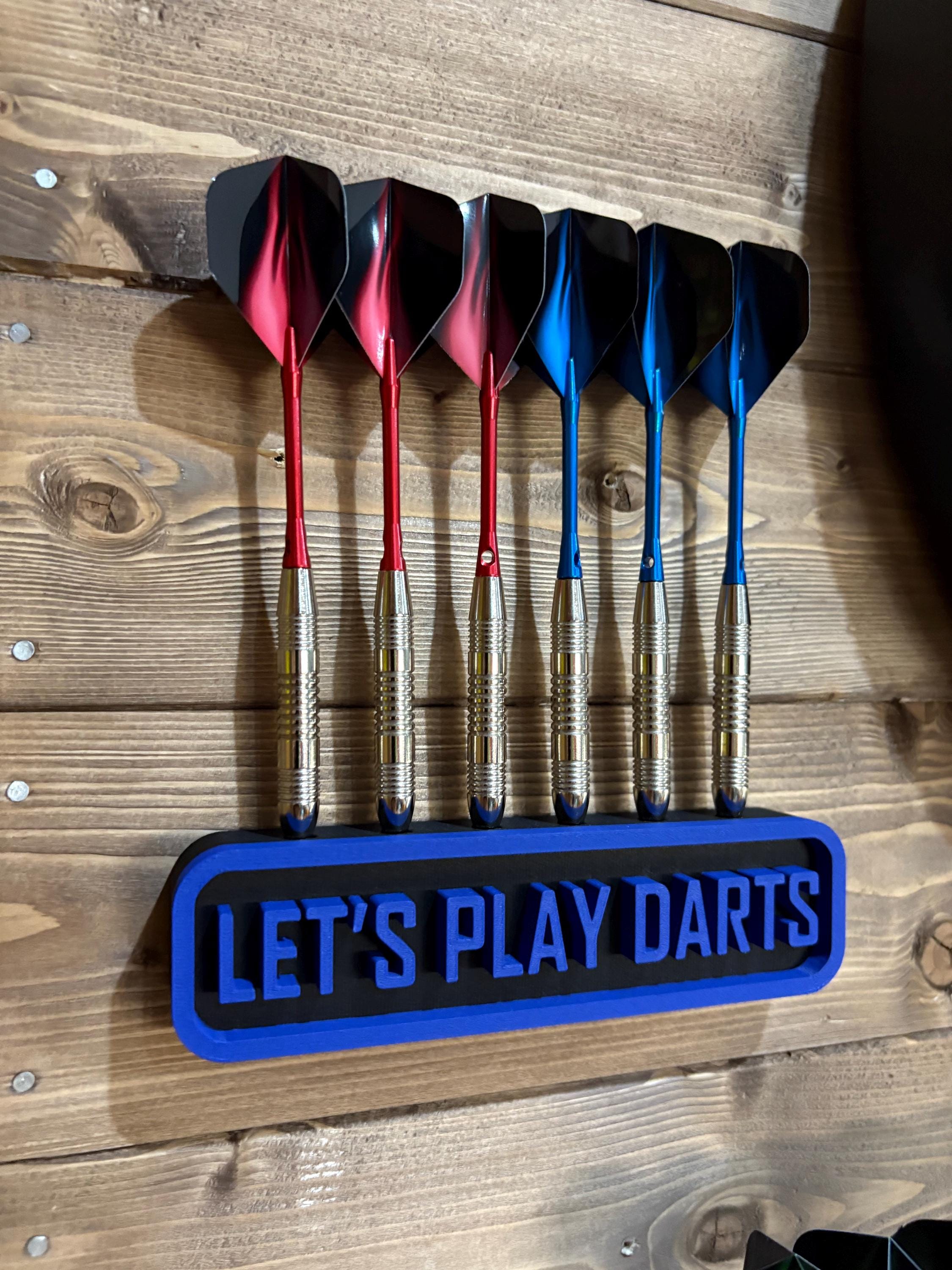 Keep your darts tidy and always ready for a game with this 6 darts holder. Featuring the playful text “Let’s Play Darts”, it’s the perfect darts accessory for any home bar, games room or pub corner.